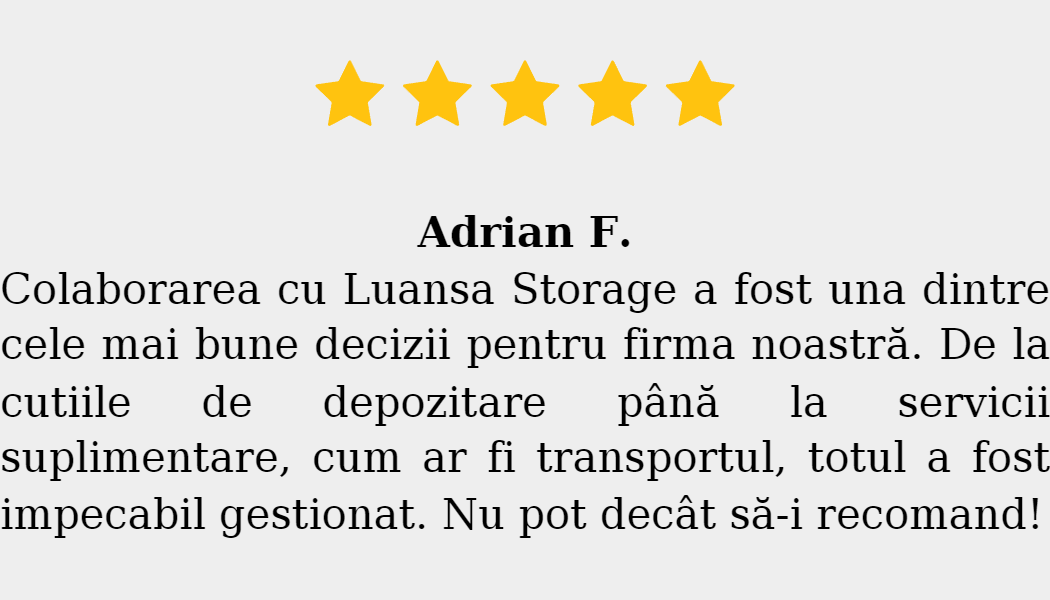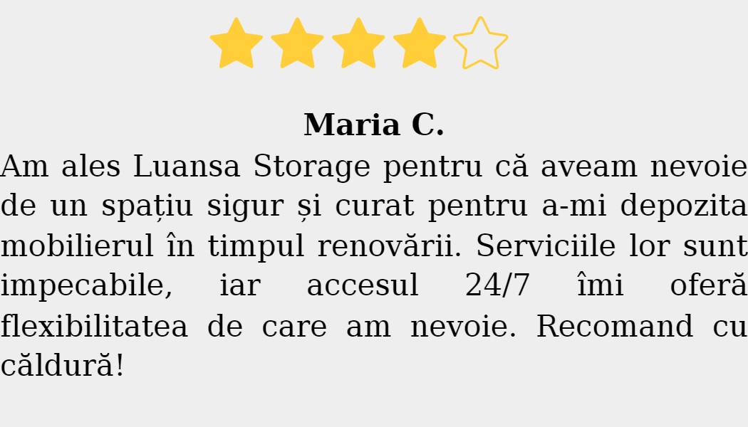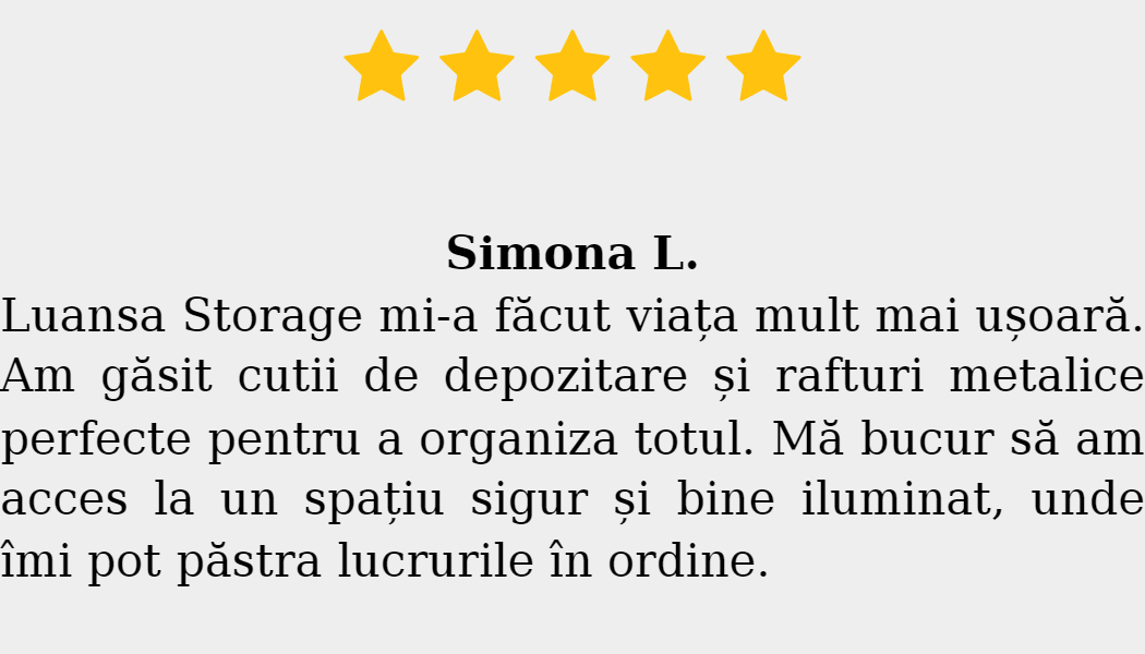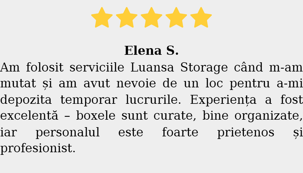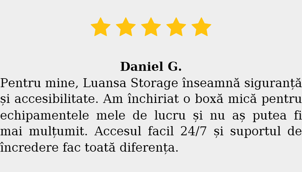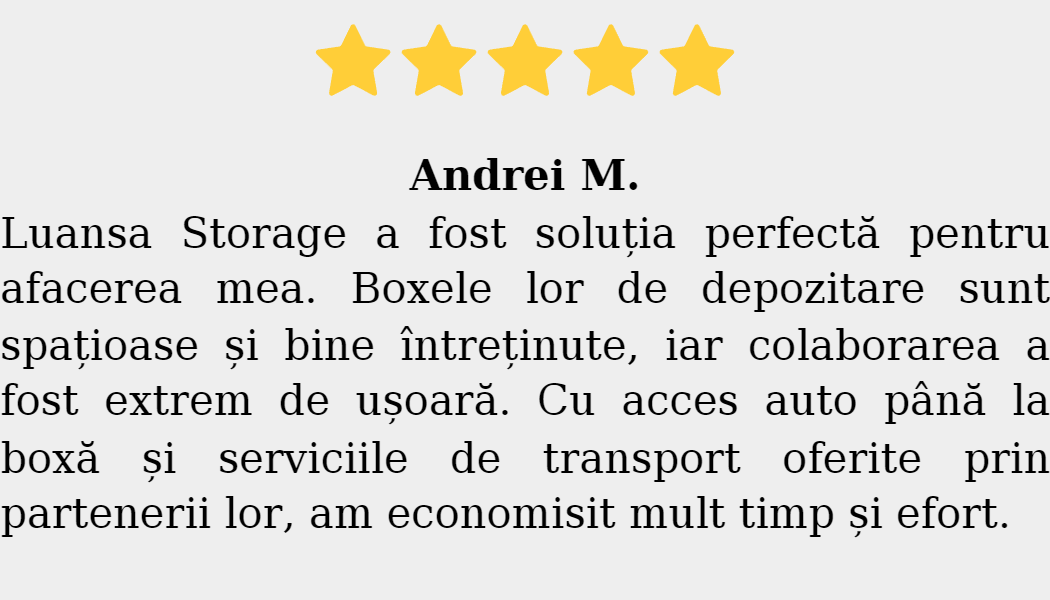 Toate contractele sunt clare, fără taxe suplimentare și fără obligații pe termen lung. Poți închiria o boxă pe perioada dorită și poți accesa bunurile oricând datorită programului non-stop. Flexibilitatea, siguranța și accesibilitatea fac ca spațiile de depozitare Iași oferite de Luansa Storage să fie soluția ideală pentru locuințe, birouri, afaceri mici, companii și e-commerce.