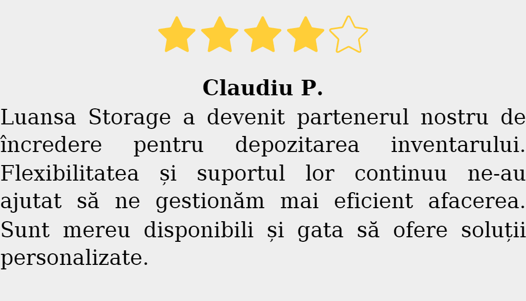 Persoanele fizice folosesc spațiile de depozitare Iași pentru perioade de tranziție precum mutări, renovări sau depozitare sezonieră. Companiile aleg boxele de închiriat Iași pentru depozitare marfă, arhivă, echipamente sau stocuri temporare. Spațiile pot fi extinse sau reduse în funcție de necesar, ceea ce face serviciul ideal pentru afaceri care au nevoie de flexibilitate. Prin structura sa, Luansa Storage oferă cel mai avansat sistem de depozitare pentru firme Iași și pentru utilizare personală.